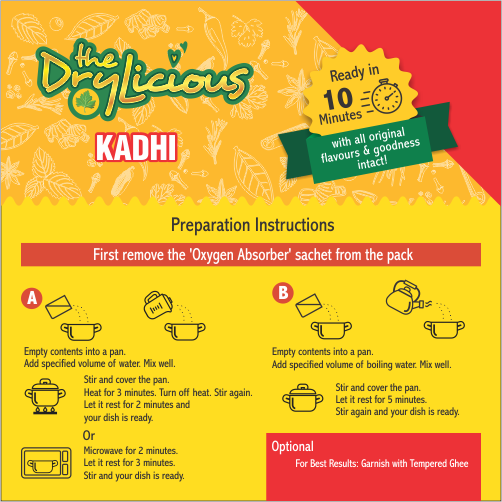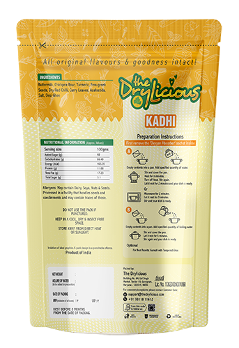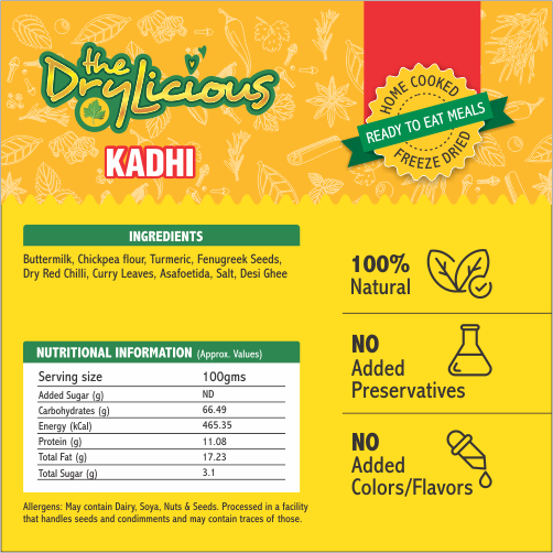 A traditional yogurt-besan curry with pakoda and a gentle tadka, freeze-dried to preserve flavour. Just heat with water and enjoy.
