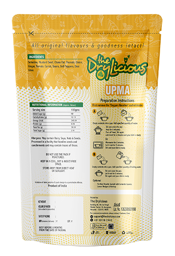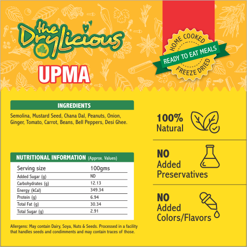 Classic suji upma made with veggies and tempered spices, freeze-dried to preserve authentic taste. Just add hot water and stir.